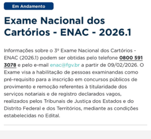 Informações sobre o 3º Exame Nacional dos Cartórios – ENAC (2026.1) podem ser obtidas pelo telefone 0800 591 3078 e pelo e-mail enac@fgv.br a partir de 09/02/2026. O Exame…